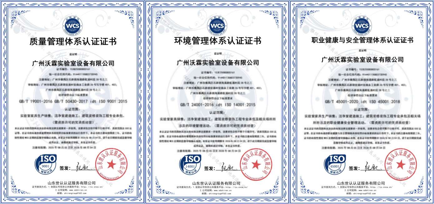 沃霖實驗室是潔凈行業優秀施工建造企業,擁有建筑裝修工程專業承包二級、電子與智能化工程專業承包二級、環保工程專業承包二級、建筑機電安裝工程專業承包二級等資質。先后通過ISO9001:2015、ISO14001:2015、ISO45001:2018 認證,知識產權管理體系認證,擁有多項發明專利、二十余項實用型專利及十余項軟件著作專利。